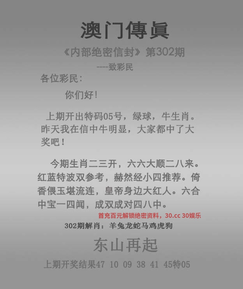 传真302期:开猴22 今期生肖二三开,六六大顺二八来。 红蓝特波双参考,赫然经小四推荐。 倚香偎玉堪流连,皇帝身边大红人。 六合中宝一四闻,成双成对四八中。 东山再起 解:今期生肖二三开指23羊,六六大顺二八来指06鼠28虎,红蓝特波双参考指红波蓝波,成双成对四八中指双肖龙马猴虎鼠狗。 拐特生肖:羊龙马猴兔鼠狗鸡猪 越前越主,如有雷同,我是原创!你抄袭 以上分析只代表个人理解,对错勿怪 |