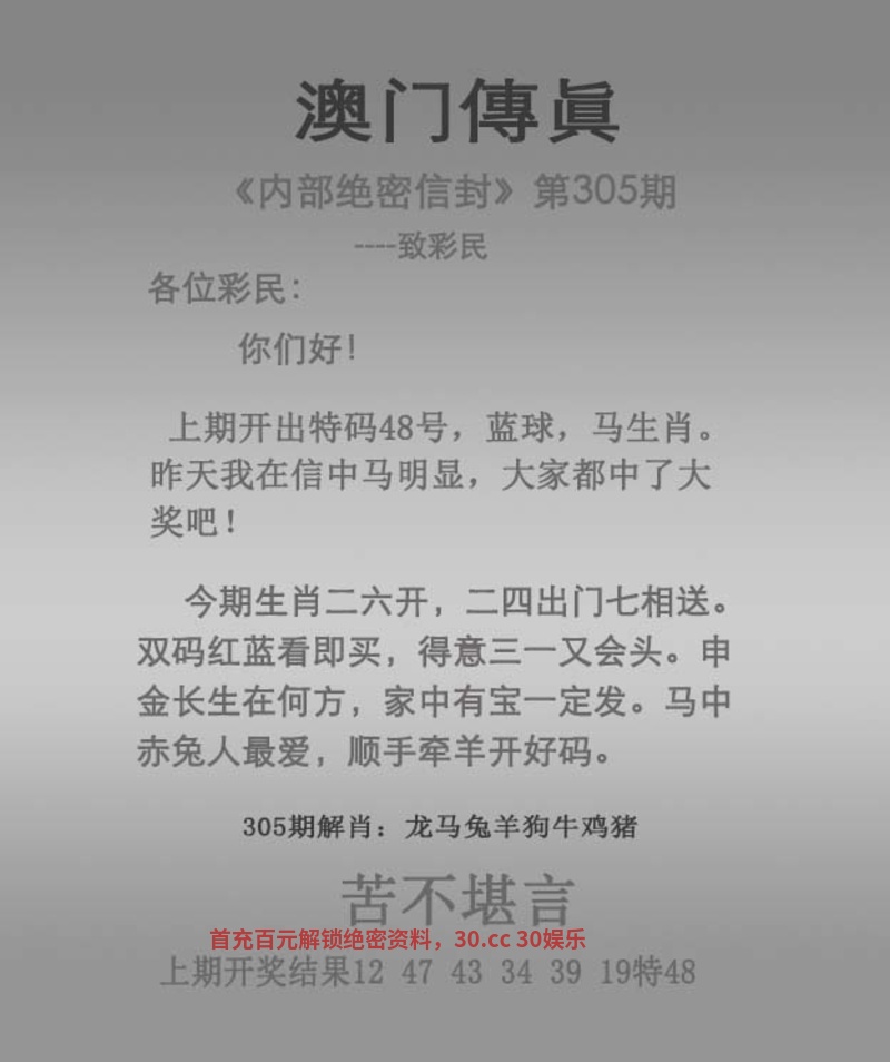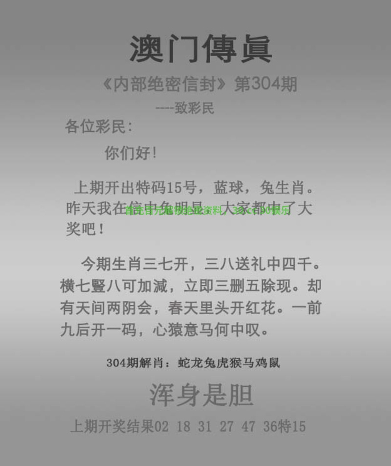 传真304期:开马48 今期生肖三七开,三八送礼中四千。 横七豎八可加減,立即三删五除现。 却有天间两阴会,春天里头开红花。 一前九后开一码,心猿意马何中叹。 浑身是胆 解:今期生肖三七开,解大数特码25-49,却有天间两阴会,解阴肖鼠龙蛇马狗猪。 拐特生肖:兔鼠虎马牛猪羊蛇狗 越前越主,如有雷同,我是原创!你抄袭 以上分析只代表个人理解,对错勿怪 |