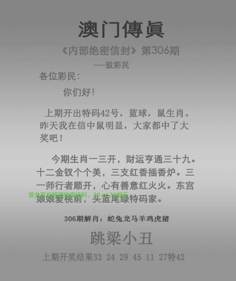 传真306期:开牛17 今期生肖一三开,财运亨通三十九。 十二金钗个个美,三支红香插香炉。 三一师行者顺开,心有善意红火火。 东宫娘娘爱桃前,头蓝尾绿特码家。 跳梁小丑 解:今期生肖一三开,解单肖兔牛猪鸡羊蛇,东宫娘娘爱桃前,解女肖兔蛇羊鸡猪。 拐特生肖:猴猪虎蛇鸡牛马鼠羊 主特:10.07.16.13.09.17.36.30.11 越前越主,如有雷同,我是原创!你抄袭 以上分析只代表个人理解,对错勿怪 |